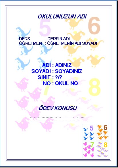 Microsoft Office Word programında hazırlanmış Çeşitli tablolar ve resimler eklenmiş hazır ödev kapaklarını kendi bilgilerine göre değiştirip kullanabilirsiniz.Ödev hazırlayanların işine yarayacak türden dosyalar tavsiye edilir. Kapakların içinde her ders için : Matematik, Geometri, Fizik, Kimya, Sosyal Bilgiler, Türkçe, Biyoloji ve diğer tüm dersler için hazır dönem ödevi kapakları bulunmaktadır.