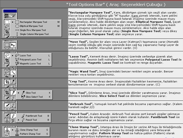 Tool Options Bar(Araç Çubukları)- Ne anlamlara geldiğini öğrenmek içni alttaki resmi inceleyip uygulama testlerinize başlayabilirsiniz.